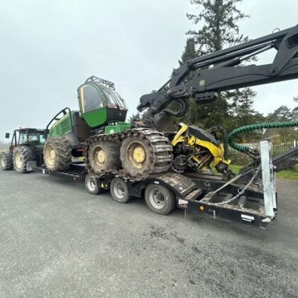 Machine d’occasion de l’année 2014 totalisant environ 17 450 heures (évolutif). Cabine tournante avec correction de dévers conforme aux normes ROPS, OPS, et FOPS, équipée de phares halogènes cabine, cime grue et éclaircie, d’un siège BEGE confort, de rideaux pare-soleil sur toutes les vitres, d’essuie-glaces, lave glace latéraux ainsi que d’une imprimante. Moteur diesel John Deere PowerTech Plus 6090HTJ, 6 cylindres, développant 170 kW (228 ch), avec un filtre séparateur d’eau supplémentaire. Transmission hydrostatique, avec un ponts avant et arrière dotés d’un blocage de différentiel électrohydraulique. Pneumatiques sont des Nokian Forest Rider : 600 x 26.5 à l’avant (2746 mm) et 600 x 34 à l’arrière (2680 mm), avec environ 70% d’usure restante. Grue CH7 de 10m, commandée par joystick électrohydraulique, avec contrôle automatique du tilt et amortissent de grue. Tête d’abattage H480C sans nourrice, équipée d’un rotateur BBR15HD, de moteurs de rouleaux Poclain 500/780 cc, de protections de rouleaux, de deux rouleaux extérieurs acier à picots et deux rouleaux inférieurs acier à picots. Elle dispose d’une scie Hultdins Supercut 100 avec moteur hydraulique Parker, de protections additionnelles pour les moteurs intérieurs et la scie, d’une prédisposition pour le système de mesurage et d’une roulette de mesurage à pointes acérées. La machine fonctionne à l’huile hydraulique minérale et comprend des pompes électriques de remplissage pour l’huile hydraulique et le gazole, ainsi qu’une pompe à vide.